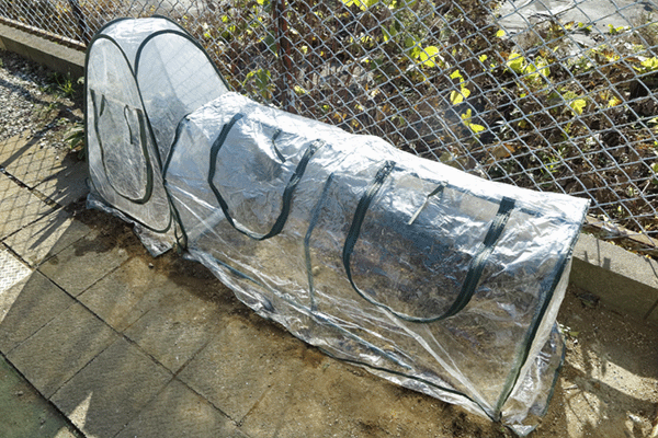 昨日、小型のビニールハウスを組み立てて、今日、葉物野菜の種を蒔きました。